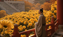 “满城尽带黄金甲”实际上就是战乱之后的自我高防御装状态。显然,穿戴金甲的不可能是黎民百姓,更不可能是被黄巢屠戮的唐朝勋贵与门阀士族,而是以他为中心的反抗势力。此刻的菊花也不再是带有诗情画意的文人符号,而是暴力与权力的象征。古代改朝换代大多都是在这样的战乱中实现的,一个新的利益集团以暴力手段夺取了所谓的“天命”,却没有将自由与幸福真正还给人民,而是在“家天下”的逻辑里周而复始。