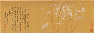 故宫博物院藏《建兰图》卷最宜用来“入门”。绢地素净,深秋建兰并列而立,花茎细挺,花朵素白,中间点出几瓣将落未落的花片,画面几乎不借外物,不画山石作底,让兰的气息自成一派风景。恽寿平用没骨写兰,明暗转折都藏在水分与设色的交融里,枝干以赭色轻点,花瓣施白粉,花蕊略以淡紫提神。淡处有气,浓处能收,卷左题跋记友人赠兰因缘,自言“清芬不散,尘襟洒然”,画与诗互相照映,让兰的明净高洁不止停在画面,也能落到观者心中,这也与“鹫峰”的寓意相合。