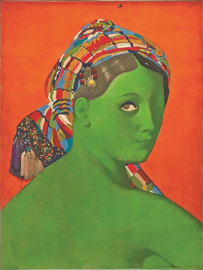 总结完结构与笔触,当然也该夸夸本展的核心——色彩的好处。法国画家马歇尔·雷斯1964年制作的《大宫女》被选上了海报。这件作品脱胎于19世纪新古典主义大师安格尔的《大宫女》,原作中典雅线条与和谐色调被雷斯有意“篡改”,以60年代消费社会为时代背景,选用红与绿这对互补色,采用喷涂的方式呈现醒目的形象,令人立即联想到那个年代的广告用色。